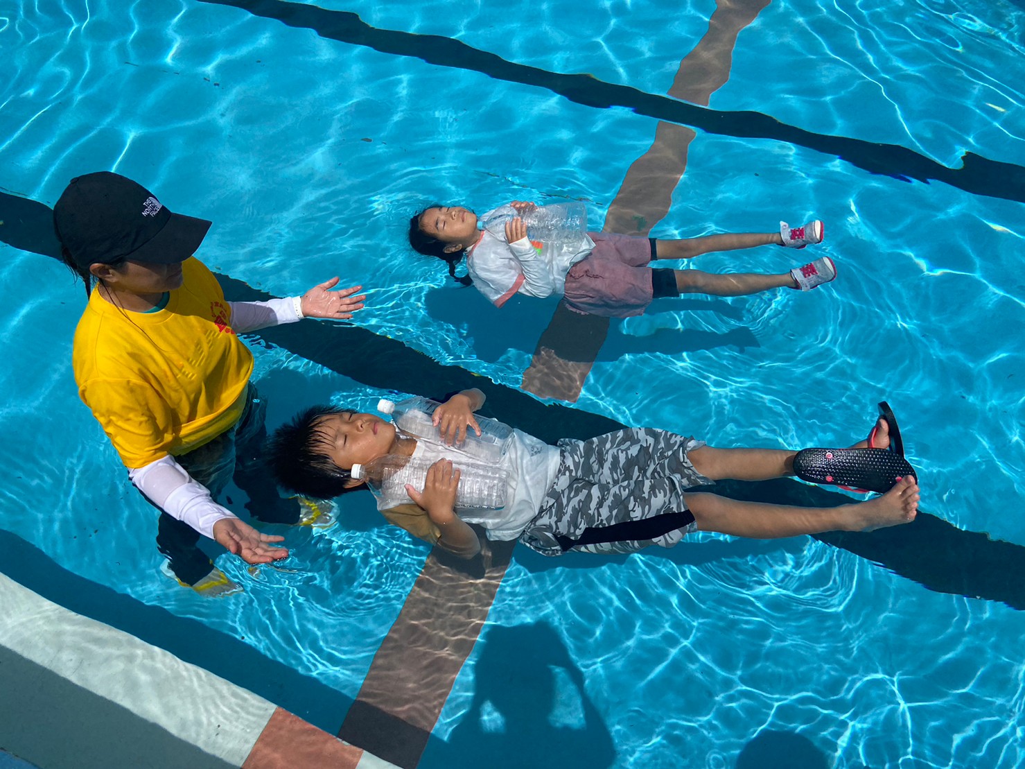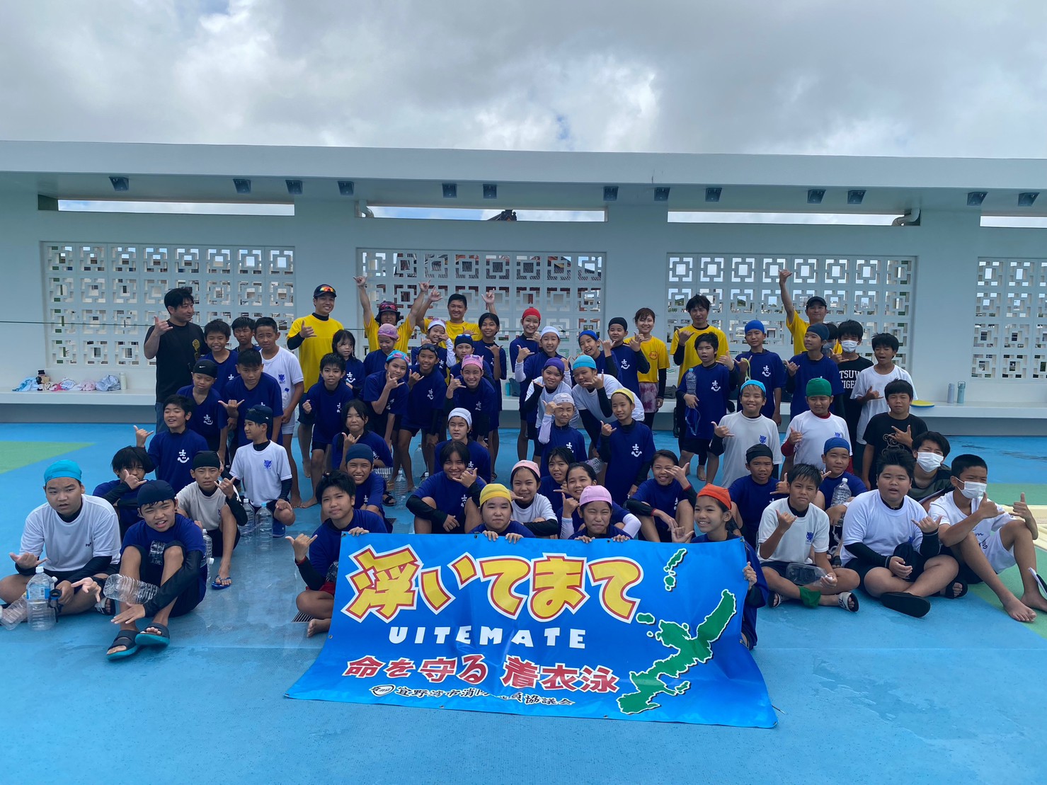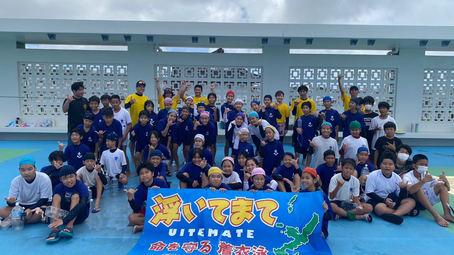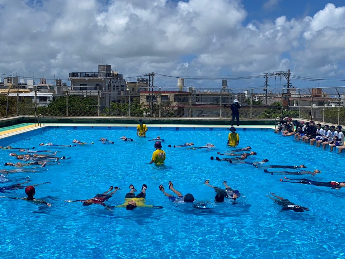 沖縄県の水難事故発生件数は毎年全国で一番多いです。海に囲まれた沖縄での水難事故を減らすために様々な職種の有志メンバーで活動を行なっています。宜野湾市内を中心に、沖縄県内の保育園〜中学校にて、「浮いてまて〜命を守る着衣泳〜」と「米国式防火教育」の講習会を実施中。子ども達に“自分の命は自分で守る”方法、“自助力を高める方法”を伝えています。2023年現在、浮いてまて教室では約8000人の子ども達に講習を実施。